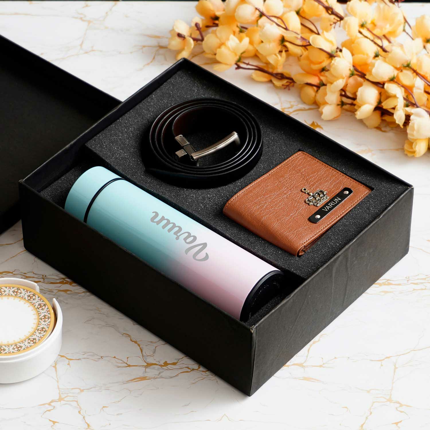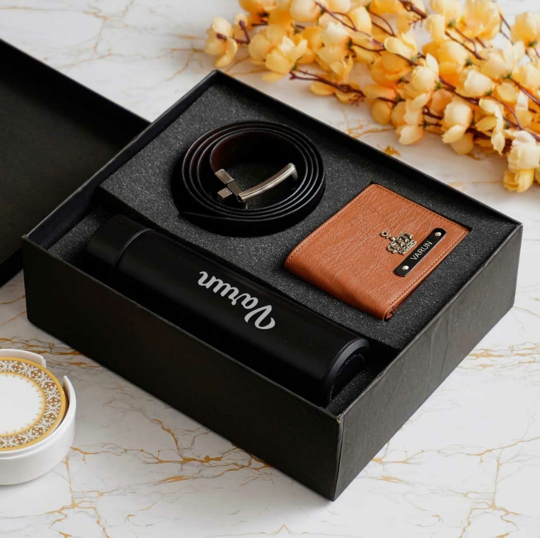 The essential accessories for men are in this pack of an exceptional hamper. This personalised hamper comes with a temperature display bottle personalized with a name. The other two item is Wallet & Belt something every man uses every day. This curated hamper is perfectly made for the events of your life that matter the most to your heart. Make any man feel noteworthy with this Curated Man’s Combo Hamper…