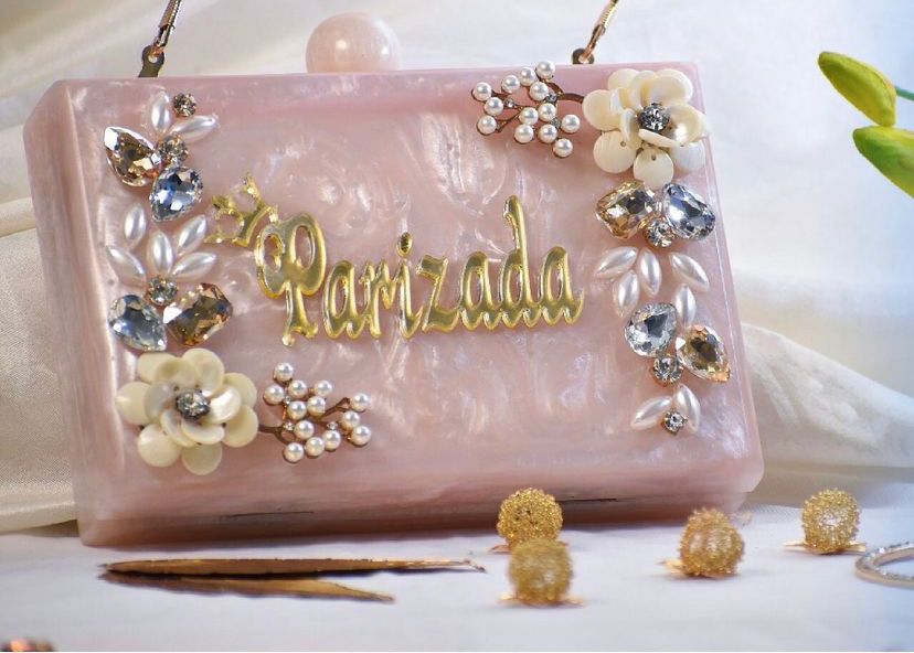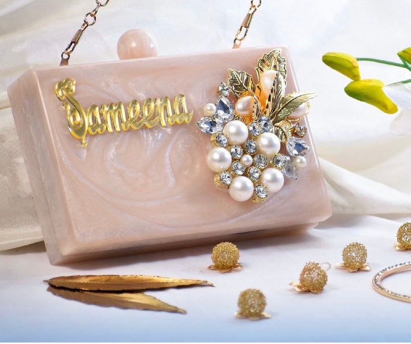 A beautiful pearl-shaped design outside the clutch with a customization option for the name of your choice.